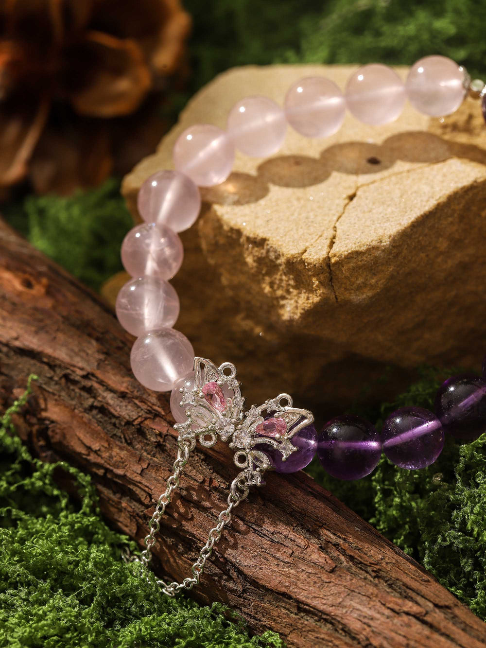 I come from a lineage of shamans, and I believe that natural crystals are not merely stones—they are the breath of the Earth.When selecting raw crystals, I never rely solely on appearance. From countless rose quartz and amethyst stones, I handpick only those with the strongest energy and the clearest textures, crafting pieces that resonate with both nature and the wearer.This bracelet draws its inspiration from the interplay of flowers and night: