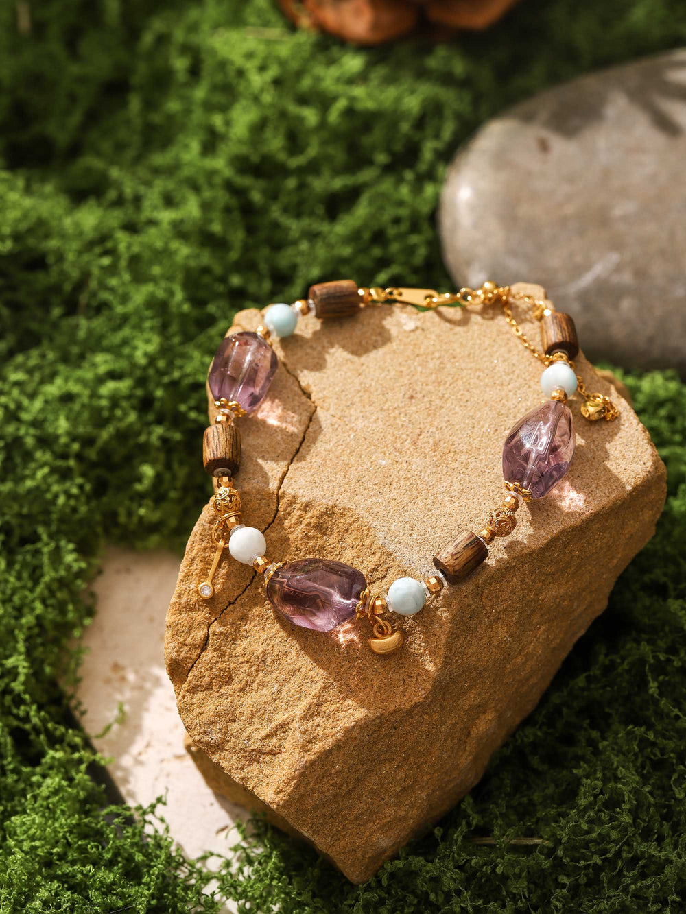 As a shamanic priest, I select crystals not by appearance, but by the subtle pulse they emit in my hands.Among countless stones and woods, I choose amethyst that carries the rhythm of nature,blending it with wooden elements and metal chains,so that the tranquility of the forest meets the urban shimmer.This bracelet is more than an accessory—it is a wearable piece of art, capturing the whispers of the forest and the rhythm of the earth.