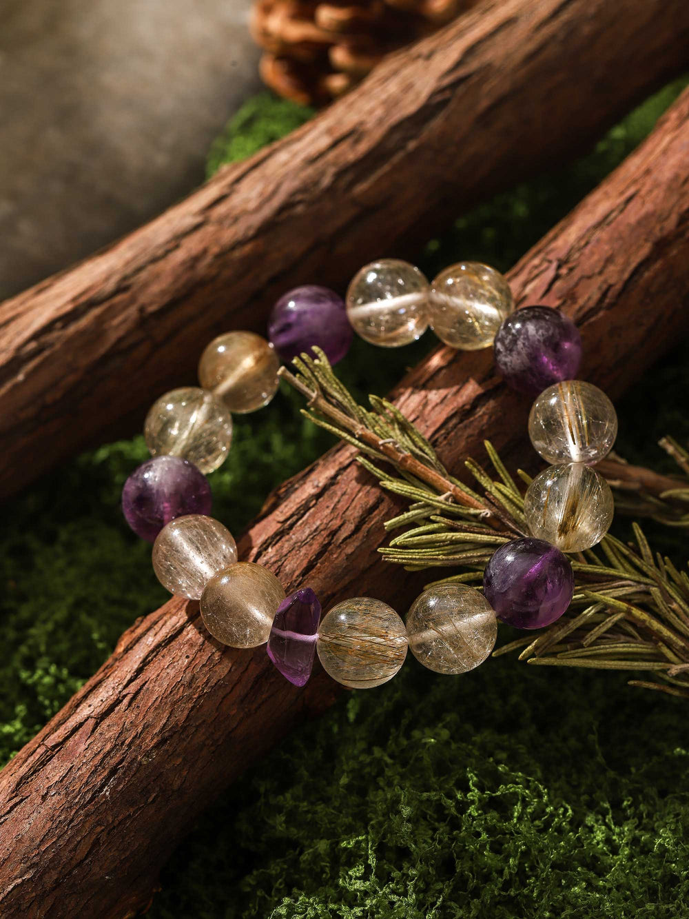 I come from a Shaman family in Northeast China, inheriting the energy traditions of the Qing dynasty royal bloodline.Amethyst symbolizes depth and tranquility, while Golden Rutilated Quartz is regarded as a carrier of wealth.When selecting the stones, I follow my family’s intuitive method, choosing only those crystals that resonate subtly in the palm of my hand, allowing them to connect with each other, just like the night sky and the stars.This bracelet awakens the wearer to experience the harmonious resonance of wisdom and abundance.