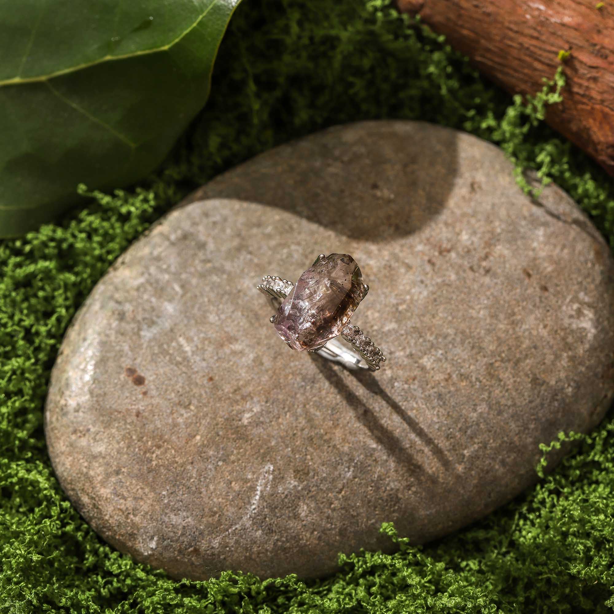 I was born into a shamanic family that empowers crystals. From a young age, I’ve been able to sense the pulse of crystals and the earth. Each crystal requires me to meditate, close my eyes, and listen to its breath. Only those whose energy resonates most clearly with my soul will be chosen.The main stone of this ring, the Black Super Seven Hair Crystal, was sensed during a forest retreat. Its deep color and unique inclusions resemble a sleeping nebula in the night sky, radiating a distinctive energetic vibration.I believe each Purple Ghost within the crystal carries the protective energy from the earth’s core. It is not merely an ornament but a spiritual talisman.