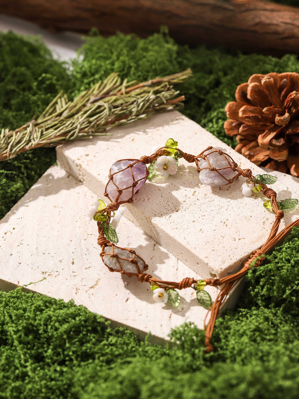 This "Whispers of the Forest" bracelet is crafted with natural amethyst stones personally selected by me, a shamanic priestess, as the centerpiece, adorned with delicate floral and leaf accents. Amethyst has long been regarded as a symbol of wisdom and balance, like a soft lavender hue in the forest's twilight—cool and glowing with a faint light. Each stone seems to hold the whispers of the forest, weaving the tranquility and mystery of nature around your wrist, so that even in the city, you can feel the breath of the mountains and woods.