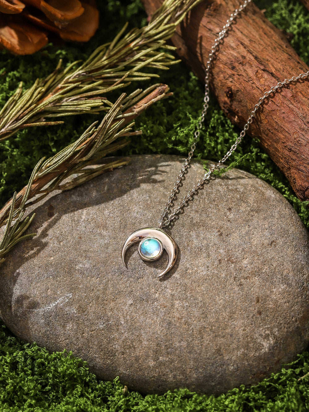 I come from a shamanic lineage that channels the natural power of crystals. Among countless raw stones, I select only those with the purest glow and strongest energy, allowing each piece to record the breath of heaven and earth.This pendant is set with a moonstone in a crescent shape. In metaphysical symbolism, the crescent moon represents cycles, renewal, and hidden power, embodying new beginnings and the potential within. The moonstone, with its soft blue-white glow, resembles the quiet light of the night sky, symbolizing tranquility and natural balance.Together, these elements form an intersection between the moonlit night and the human heart, allowing the wearer to experience the pure beauty and story from nature in everyday life.