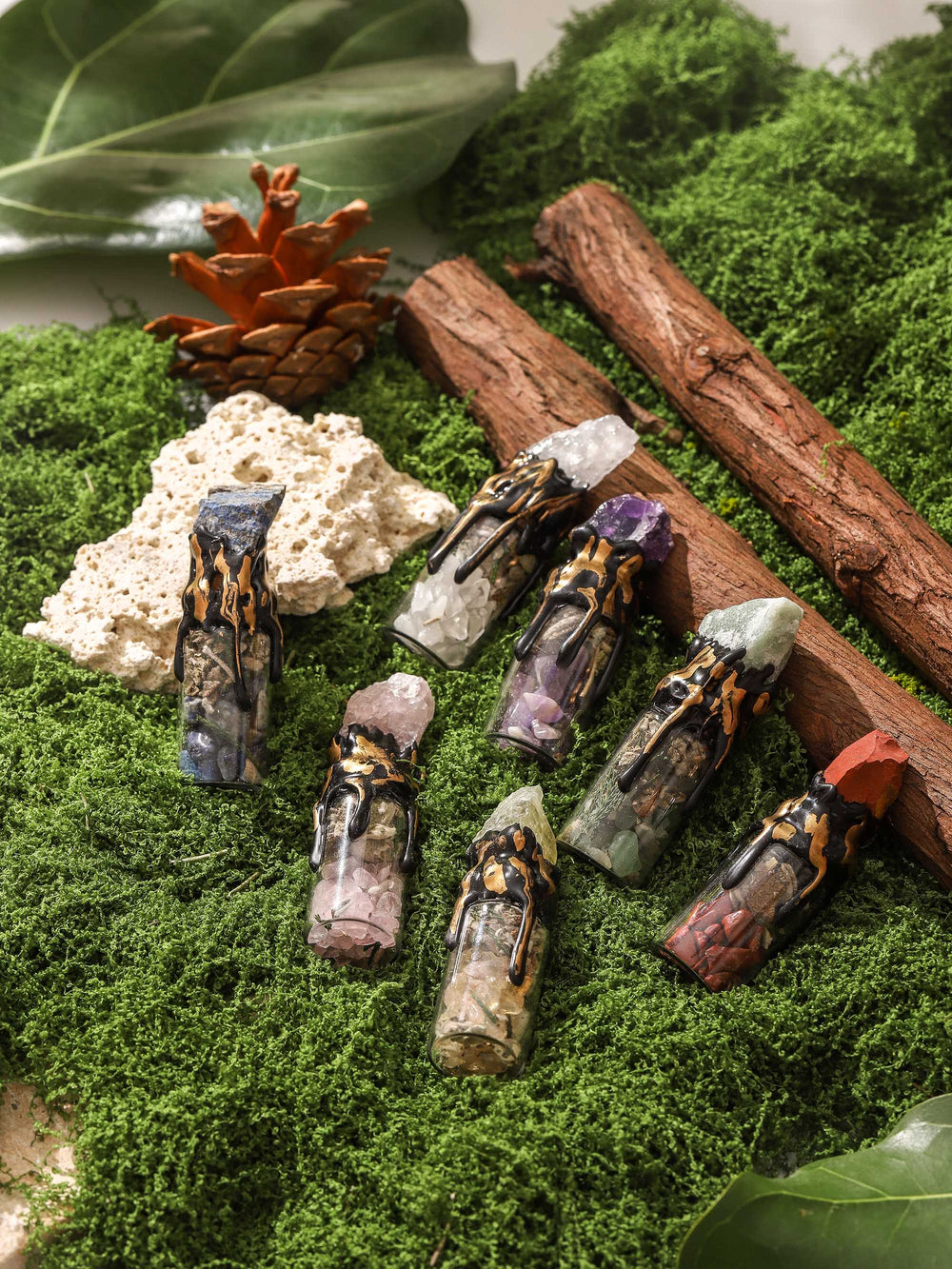 Rooted in my family’s shamanic traditions, each bottle of crystals represents the protection of a natural force.On a full moon night, I place seven types of natural crystals into an ancestral totem array, invoking their energy with sacred chants and ritual tools—Pink symbolizes love, orange activates thinking, yellow guards wealth, green balances health, blue brings wisdom, white stabilizes focus, and purple enhances charm.This is a journey of seven blessings. May you feel the power of nature at every moment.
